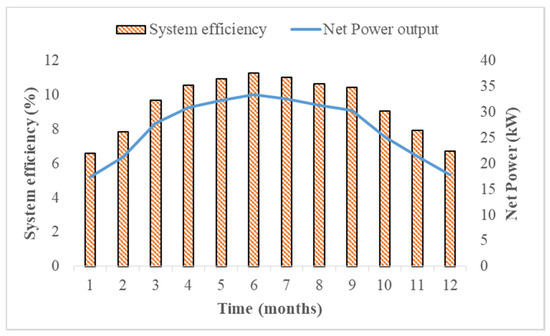 The average daily variation in the system efficiency and net power output for each month throughout the year.