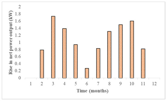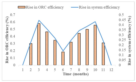 The overall performance of the solar ORC system was depicted by the system’s efficiency. It was the product of the ORC and collector efficiencies. Moreover, the net power output was computed using the difference between the power generated by the turbine and that consumed by the pump. Figure 8 depicts the change in the daily average system efficiency and net power output of the PCM based-DVG solar ORC system for each month. It was found that both parameters (system efficiency and net power output) increased and decreased with the changes in climatic conditions (ambient temperature and solar radiation). The trend shown by both parameters (system efficiency and net power output) was observed to be similar to the collector and ORC efficiencies. The maximum and minimum values of the system efficiency and net power output was found in June and January, respectively. The average daily system efficiency and net power output for each month throughout the year were observed to be 9.31% and 2.68 kW, respectively. The system performance in terms of the system efficiency and net power output was observed to be at a maximum in summer, while its value was at a minimum in winter.