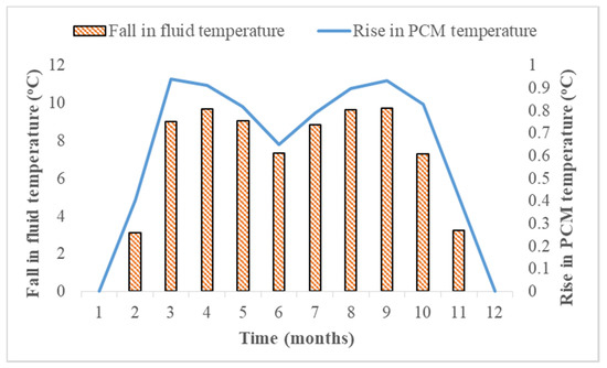 The variation in the average daily working fluid temperature and rise in the PCM temperature for each month throughout the year.