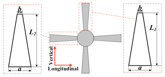 The basic QTOPS consists of four trapezoidal legs and a central plate. As shown in Figure 1, the legs are arranged around the central plate in a decussate form. A single plan-view for the trapezoidal leg is also defined with proper dimension parameters. The legs can be divided into two groups: two vertical ones with a length of L1 and two longitudinal ones with a length of L2. The QTOPS structure can be regarded as a classical cross-beam-mass pattern, in which the central plate is treated as a rigid mass and supported by the four legs. Based on the displacement of a conventional cross-beam-mass structure and setting L1 = L2 = L for simplicity, the stiffness of QTOPS K can be correspondingly written as [27]
