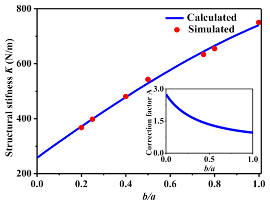 A1 is derived from the derived by Sader et al., considering the effect from the shape of the cantilever beam [28,29]. A2 is a supplementary part to accurately represent the cross-beam-mass model of QTOPS, which is obtained by fitting the relationship between the simulated displacement and loaded force of structures with different b/a. With the obtained function, the structural stiffness can be plot vs. b/a with E = 198 GPa, t = 0.2 mm, a = 15 mm, and L = 50 mm. Figure 2 shows the calculated stiffness of the basic structure and the results from the force–displacement relationship simulated by finite element analysis (FEA). It can be seen that correction factor A realizes a favorable precision in bridging the calculated and simulated stiffness. The obtained curve indicates the direct proportion between K and b/a.