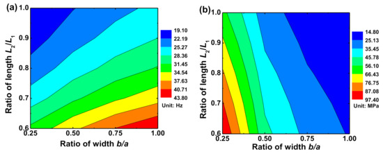For a certain structure, there are two operating parameters closely related to the performance of PVEH: structural resonant frequency impacts the efficient frequency for PVEH and structural stress under external load determines the energy conversion capability. Sometimes, the frequency and stress can be utilized to evaluate the potential of the proposed structure in constructing a high-performance PVEH [1,30]. With the stiffness function, the eigenfrequency and stress of the basic QTOPS can be easily calculated. A central mass weighing 25 × 10−3 kg is added to the model, and an 10 m/s2 acceleration is applied. Figure 3 plots the results for structural eigenfrequency and the maximum stress of a leg under different combinations of leg length ratio and b/a. In the analysis, the length of two vertical legs (L1) is set as 50 mm and the two longitudinal legs are shortened to achieve different length ratios (L2/L1). A lower frequency can be observed under a larger L2/L1 ratio and smaller b/a, and a larger stress can be obtained under a smaller L2/L1 and b/a. The results verify the enhancing capacity of unequal-length configuration and a trapezoidal-shaped leg. Based on the results, the basic structure with the combination of b/a = 0.5 and L2/L1 = 0.8 is chosen as the fundamental frame to construct the desired PVEH.