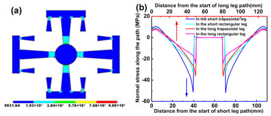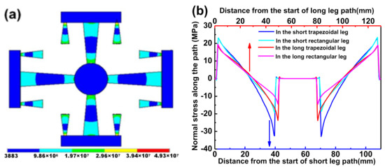 Figure 5a presents the stress distribution in the proposed QTOPS under Case 1. For easy description, the leg end connecting with the central plate is denominated as the top end, and the other one is named as the base end. It can be seen that more considerable stresses develop at the top end of legs. More clarity for the stress distribution is plotted in Figure 5b by mapping the normal stress onto the preset paths, which are coincident with the centerline of their corresponding legs (also shown in Figure 5a). In Figure 5b, the sharp variation of every curve presents the stress decrease in the thick plate region, which has the same length in every curve but is modulated by the different scales for long and short legs. Compared with conventional QROPS, the stress in the top end of the short and long leg is lifted to 152.8% and 150.4%, respectively. Meanwhile, the stress distribution curves also verify the enhancing effect of the proposed unequal-length configuration. The maximum stress of the short leg in QTOPS is 41.8% larger than that of the long leg. Based on the results, the piezoelectric plates should cover the top end of the short leg to make better use of the energy seized by QTOPS.