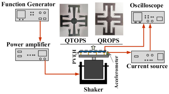 An experimental setup, as shown in Figure 8, is built to test the prototypes. Stimulating vibration is produced by a shaker system, in which the function generator (SDG1020, SIGLENT, Shenzhen, China) provides sinusoidal voltage with varied frequency and the signal is amplified by the power amplifier (SD1492A, BDHSD, Qinhuangdao, China) to excite the shaker (SD1482A, BDHSD, Qinhuangdao, China). An oscilloscope (GDS-1072B, GWINSTEK, Suzhou, China) is utilized to measure the generated voltage by PVEH prototypes and monitor the output of the accelerometer (CA-YD-180, BDHSD, Qinhuangdao, China). The current source (SD14T03, BDHSD, Qinhuangdao, China) is used to transform the output of the accelerometer into voltage form.