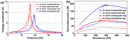 Figure 9b presents the power–load resistance curve of these devices at their resonance frequencies of 16.4 and 19.2 Hz, respectively. The best matching resistance for QTOPS-based PVEH is about 296 kΩ, and the corresponding output power is 192.9 and 84.9 µW for short and long legs; the values of QROPS-based PVEH are about 256 kΩ for optimized resistance, and 89.1 and 42.7 µW for output power in short and long legs. Obviously, the short leg in QTOPS-based PVEH generates a larger output power.