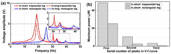 First, the open-circuit output voltage of Case 1 configurations is tested, and the voltage–frequency (V-f) curve is shown in Figure 9a. The curves with same color indicate the results of the same prototype, but the piezoelectric plates are respectively located at the short leg (solid markers) and long leg (hollow makers). The QTOPS resonates at 16.4 Hz with corresponding peak voltages of 13.45 V and 9.25 V for the short and long leg, respectively. Meanwhile, the QROPS has a resonant frequency of 19.2 Hz, and its peak voltages are 8.70 V and 6.42 V for the short and long leg, respectively. Compared with QROPS, the utilization of the trapezoidal leg provides a 1.55× increase to the generated voltage and a decline of 14.6% to the resonant frequency. Meanwhile, the short leg features a higher voltage in both QTOPS and QROPS, and the promotion can be up to 145.4%. However, there is only one resonant peak in the range of 0–50 Hz for both QTOPS and QROPS devices.