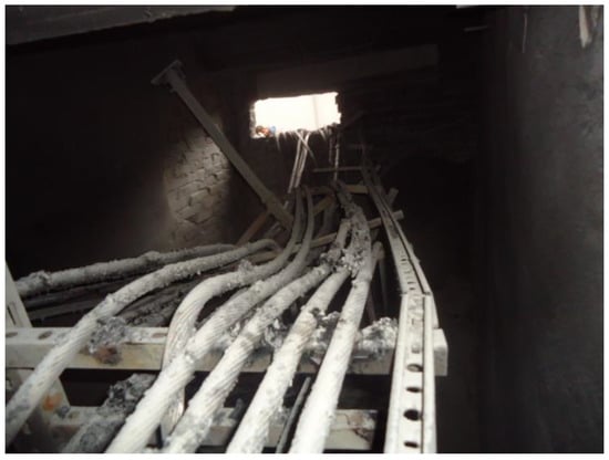 At the same time, it should be stated that the problem is not merely a theoretical one; as pointed out by Čiegis et al. [13], many existing power lines are overdimensioned by up to 60% in terms of transmitted power, which means additional costs and waste of deficit core material (e.g., copper). Desmet et al. [14] estimate that cable losses reach 5% of the total power consumption. On the other hand, the infrastructure grid has to be redesigned constantly in order to adapt to new conditions resulting from installation of new distributed generating capacities like wind farms and so forth. The wide use of power electronics devices both in industry and at households results in the presence of highly distorted current spectra. All these challenges have to be faced by the designers of cable supply systems. Their negligence may lead to serious malfunctions [11,15] or even fires of cable installations [9]. Such a situation has occurred during professional activities of the first author of the present paper. Despite considerable efforts aimed at a correct choice of cables supplying the main low-voltage switchboard in a car hood factory, after putting the installation into operation, a fire resulting from overloading one phase of the supply system has destroyed completely the cable installation (Figure 1). The considered system was designed in accordance with the guidelines included in the Polish standard PN-IEC 60364-5-523:2001 (derived from translation from IEC 60364-5 part 52 International Standard) and was supposed to withstand a 10% safety margin, however, as pointed out previously, the system experienced a serious fault soon after being put into operation. This fact has inspired the first author to carry out additional studies on current distribution of multibundle cable systems. It was found during a “postmortem” analysis that in the considered system, considerable differences between phase current values were present due to the proximity and skin effects [16].
