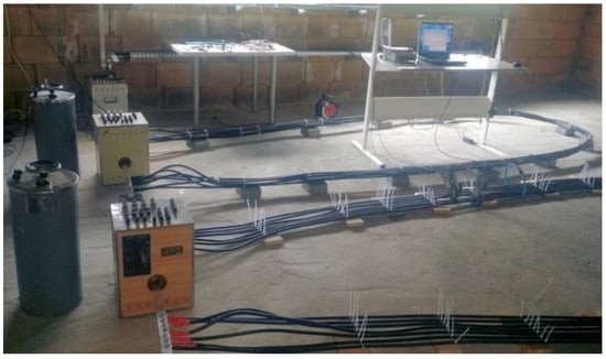A laboratory stand was developed for the experimental examination of several spatial configurations of single-phase cable systems. The photograph of the stand is shown in Figure 2, whereas in Figure 3, the considered configurations are depicted. Five of them included the strands made of YAKXS 1 × 70 cables, whereas the remaining two were made using YAKXS 1 × 240 cables. All considered configurations were excited from a single phase. For each setup, three values of excitation current were preset, that is, 200 A, 300 A, and the maximal value, possible to be obtained for the transformer used.