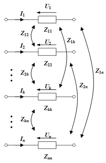 Lee considered a cable configuration technique for the balance of current distribution in parallel three-phase cables in [18]. The method requires the computation of self- and mutual impedances of the cables, which are geometry-dependent. Figure 4 depicts schematically the couplings between individual strands.