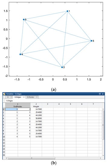 The problem with the method is that the resulting impedance matrix is a full matrix containing imaginary numbers (the elements on the main diagonal are complex numbers, since they include the strand resistances). Moreover, the computed values are relatively small in most practical cases, which causes some numerical problems with the precise determination of the inverse matrix needed in the subsequent computation step. This has led us to the formulation of a simplified method to determine current distribution, relying only on mutual distances between the strands. We have assumed that the current in the individual strand may be approximately proportional to the sum of distances of the strand to its neighbors. We have used the Graph and Network MATLAB toolbox [17] in order to introduce an abstract, geometry-independent layer, which facilitates the computations. An exemplary graph corresponding to model 2 or 4 is depicted in Figure 5a. The strand centers are represented as graph nodes and the distances between them may be written as appropriate weights for the edges (Figure 5b).