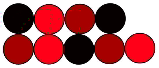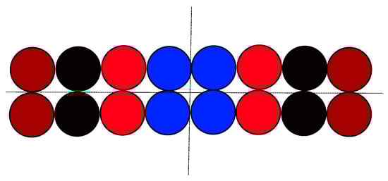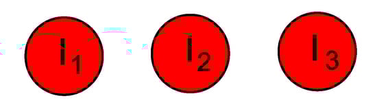 If, similar to the previous case, we assume that the distance between the cable centers is equal to unity and we set the coordinate of the center of the leftmost cable on the lower shelf as (0,0), then it is trivial to compute (e.g., the coordinates of the center of the leftmost cable on the upper shelf as (, 1)). The barycenter of the phase L1 is located approximately in the point (1.956, 0.333), for the phase L2 in the point (2.244, 0.667), for the phase L3 in the point (2.577, 0.333). The whole area of interest is the area of the rectangle with dimensions 5 × 2. The area of the triangle determined by the barycenters of individual phases may be computed using the well-known dependence given by Equation (1). In the considered case, S = 0.0503, which may be referred to as the area of the rectangle (, means the triangle area is only 0.5%. Let us notice the vertical symmetry axis passing through the center of the black wire on the lower shelf. The horizontal symmetry could not be fulfilled because of the odd number of considered wires.