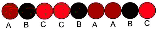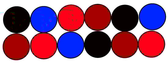 Lee has analyzed optimal configurations for three-phase three- and four-wire systems [18]. An exemplary optimal configuration for the flat layout is listed below in Figure 11. Colors brown, black, and red denote successive phases.