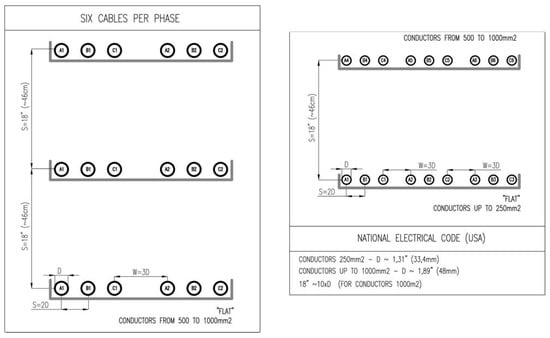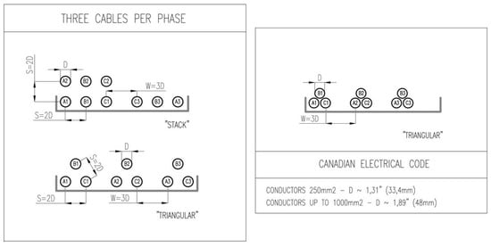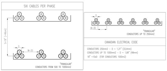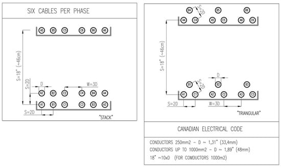 - for six strands per phase, there are some layouts recommended by the U.S. standards, which are not in use in Canada (the cables dispersed in a nonuniform manner, placed on three shelves for wire diameter in the range of 500–1000 mm2, on two shelves for wire diameter up to 250 mm2). The first aforementioned configuration features a very balanced current distribution (Tables XI and XII in [20]). The values of nonuniformity indicator do not exceed 1.04.