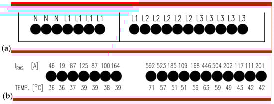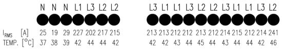 The maximal discrepancy between the gravity centers for individual phases is equal to 0.667, which, referring to the shelf width (11), is only 6.06%. The gravity center for the neutral wire may be a little distant from the other ones, because under operating conditions (under standard assumptions concerning symmetries of supply and load), the current flowing through the neutral strands takes negligible values with respect to the phase currents.