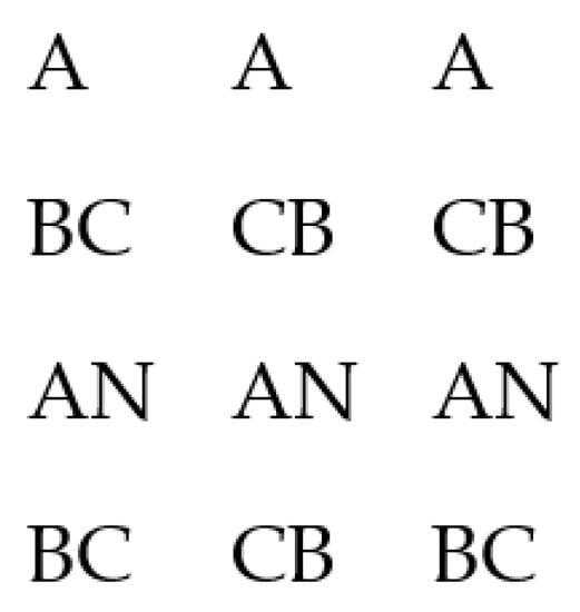 The coordinates of the barycenter for the phase L1 (A) are , for the phase L2 (B) , , and for the phase L3 (C) , . The area determined by the barycenters of individual phases is slightly higher than in the previous case, S = 0.0556, however, it remains at an acceptable level. It should be remarked that this configuration is slightly worse than the previous one, which can be confirmed with the results obtained by Lee himself (cf. the values of indicators and listed in Table 2 and Table 3 in the paper [12]).