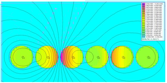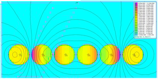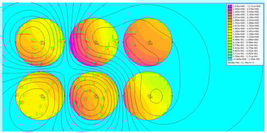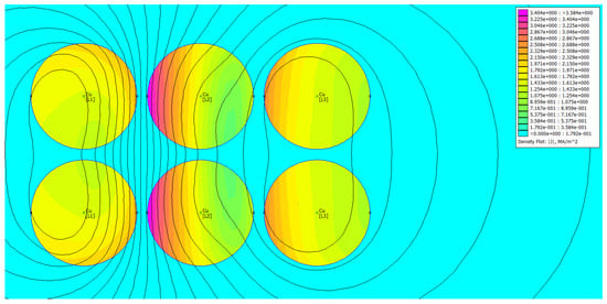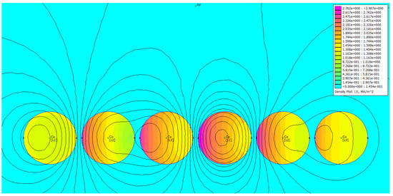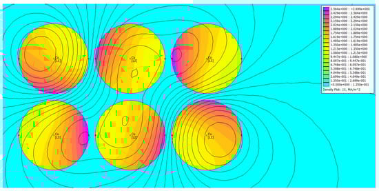 Comparing three cases depicted in Figure 28, Figure 29 and Figure 30, it can be stated that the current uniformity is obtained for the system ABCCBA, for which the phase barycenter locations overlap. For the other two configurations, the current distribution is nonuniform. Table 4 contains the results of FEM-based computations for individual phases. The subscript “1” denotes the leftmost wire, the subscript “2” the rightmost one.