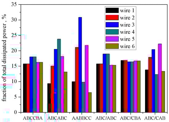 If the loss distribution shall be taken into account for individual phases, the best configuration of the six ones considered in this section shall be the layout ABC/CBA. Fractions of total loss dissipated in the wires are depicted graphically in Figure 34. Wire numbering goes from left to right for the flat layouts, for “two shelves” it is given as: wire 1–6.