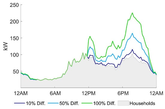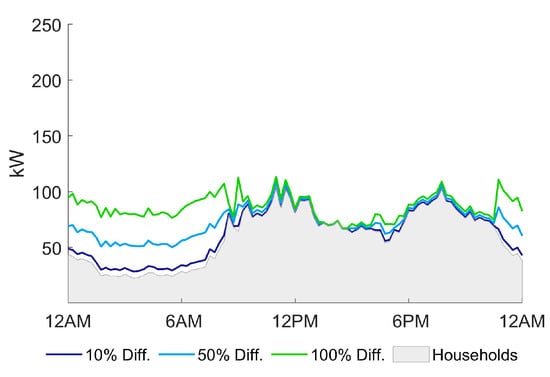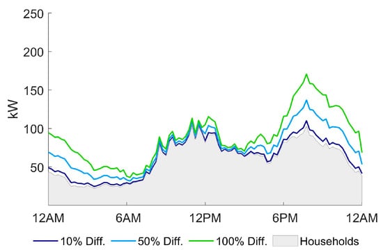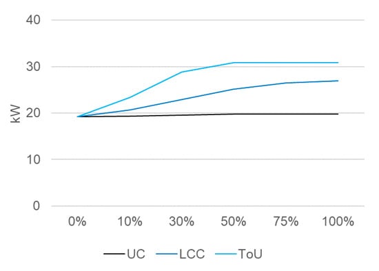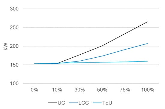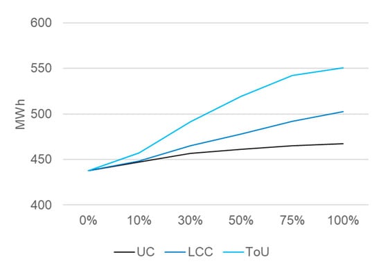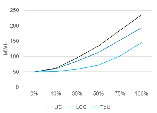 Figure 15). With uncontrolled charging increasing the base volume demand by 20% toward full BEV diffusion, the LCC approach already leads to an increase of 42%. The aim of the ToU approach to avoid HH load peaks and shift the demand into the base volume represents the most successful load shifting measure. As a result, the base volume demand increases substantially under this LM strategy up to 551 kWh—a 74% increase compared to no e-mobility.