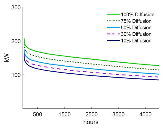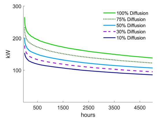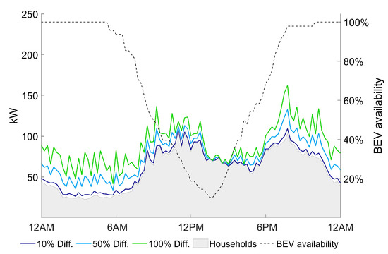 51]. Due to computing performance, the model calculates the distribution of BEV charging availability for 10 different BEV profiles. Assuming one parking lot for each HH, we extrapolated these charging profiles to the number of BEVs for specific percentages of BEV diffusion according to