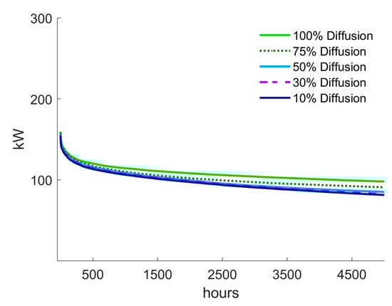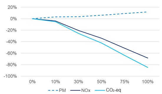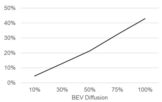 52]. Between 30% and 100% BEV diffusion, representing the situation from 2030 onwards, the electricity consumed is assumed to be almost fully renewable with specific emissions, as in the UBA “BEV(UZ-46-Mix)” [