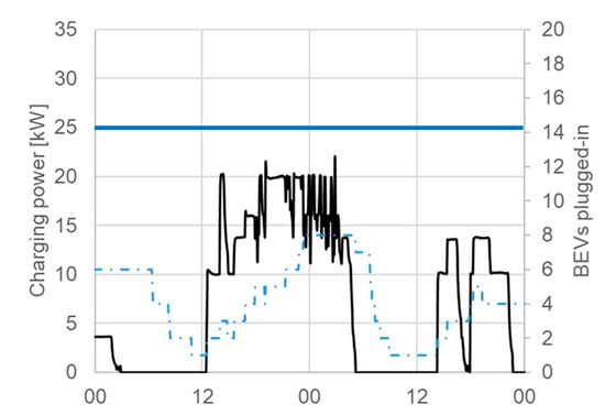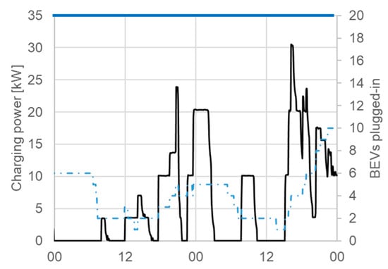 Figure 16 shows the BEV charging power with an overall initial charging capacity of 35 kW together with the number of cars currently plugged in. In this exemplary period, 31 kW was reached once during the evening, resulting in a significant impact of e-mobility on the overall building load. On the other hand,