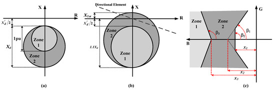 The main concept of LOE protection by the admittance based scheme is the mapping of generator capability limits from active-reactive power () plan to the (conductance-susceptance) plan [15,16]. Figure 1c shows the characteristic of the relay. Similar to the relay, time delays of and are respectively considered for the first and second zones. The conventional setting parameters of the scheme are as follows [16]: