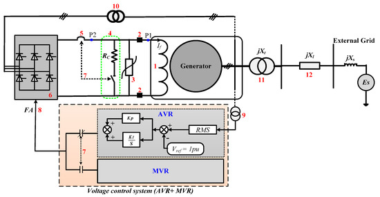 In this paper, a realistic and frequent model of a power generation unit is established by employing the PD model to examine the LOE occurrence on the basis of IEEE standard [1]. Figure 3 illustrates the overall diagram of the sample studied system comprising a generator connected to an external grid via a unit transformer and a power transmission line. The generator excitation system comprises a three phase controlled static rectifier, manual voltage regulator (MVR), automatic voltage regulator (AVR), surge absorber and crowbar system, while such a excitation system is extensively utilized in the practical applications [20,21]. Table 1 introduces the components of the studied system.