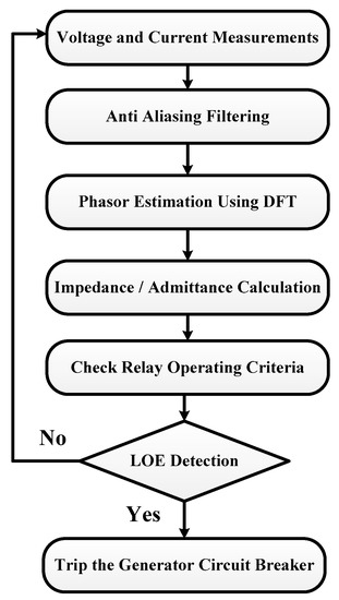 The operating characteristics of the traditional LOE relays are presented in Section 2. Figure 4 shows the general operating procedure of such relays. In this study, generator three-phase voltage and current signals are sampled with frequency sampling of 1200 Hz. A low pass anti-aliasing filter with cutoff frequency of 600 Hz is employed to eliminate the probable high frequency components. Then, discrete Fourier transform (DFT) is used to estimate the related voltage and current phasors . After that, impedance and admittance phasors are calculated. Finally, the impedance/admittance trajectories are compared with the relay protective zones in plan to make a decision about LOE occurrence.