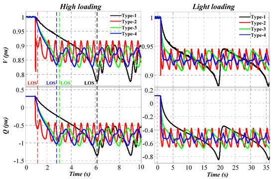In this scenario, the generator initially injects into the system and the is equal to 75.8°. Figure 8 (second column) illustrates the variation of and during PLOE events for different values of . As can be seen and compared to the previous case, the loading level significantly affects the generator dynamic behavior for specified values of . Interestingly, LOS does not occur for in light loading condition, and the generator continues working with a reduced level of and a leading power factor, changed from the initial lagging one.