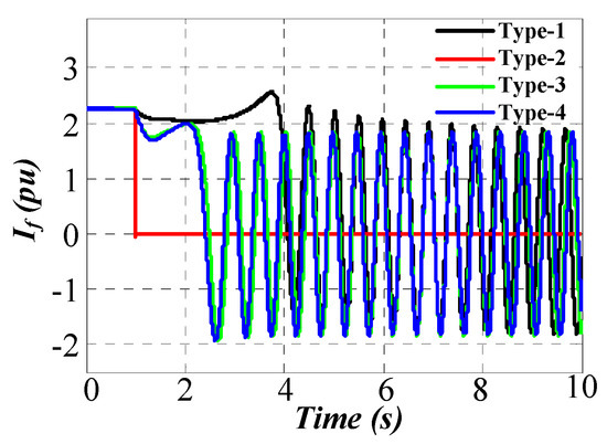 In this case, the generator initially delivers to the system, while all types of mentioned CLOE events are applied at through single scenarios. Figure 5 (first column) depicts the variations of and during such CLOE events. It is obvious that the generator dynamic behavior differs significantly during the mentioned CLOE events, while the generator experiences a loss of synchronism (LOS) phenomenon at different instants. It should be noted that after LOS occurrence, the generator parameters such as and changes oscillatory, as can be seen in Figure 5. Moreover, Figure 6 illustrates the variations of generator field current during the mentioned LOE events in generator high loading operation. As can be seen, during Type-2 failure, becomes instantaneously zero, while during the other failures and after a gradual decrease, circulates in the field winding as an AC current with the generator slip frequency.