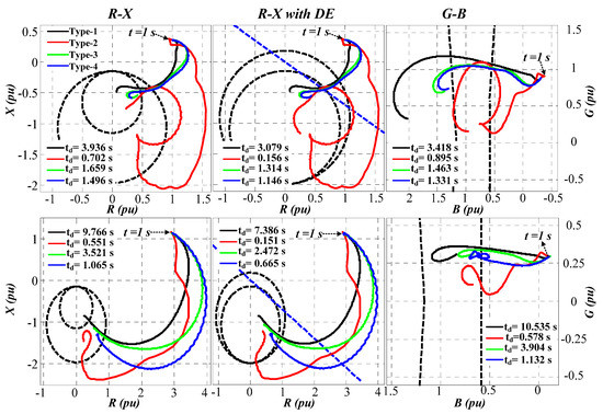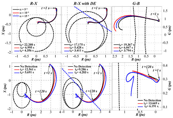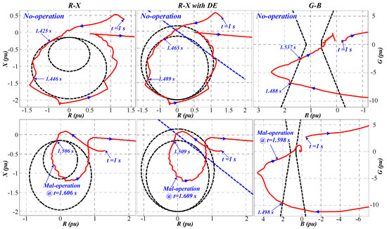 In this scenario, the generator initially delivers to the system. To create an SPS condition, a symmetrical short circuit fault is exerted on the generator terminal at , while the fault is cleared after . Then, the generator confronts an SPS phenomenon. Figure 10 (first column) shows the behavior of the traditional relays in the face of such condition. As can be seen, the impedance and admittance trajectories come into the relays protective zones during such condition, though the relays stay secure and do not exhibit mal-operations. Indeed, the typically designated time delays are enough to prevent mal-operations during this particular case.