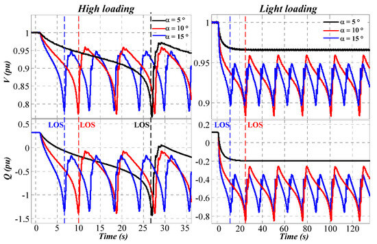 In this scenario, the generator preliminary loading is and the is equal to 67.6. A changeover from the AVR to the MVR mode is made at , and the MVR adjusts the new value of FA as . Figure 8 (first column) illustrates the variation of and during PLOE events and for different values of . It is clear that the higher values of leading to faster generator dynamics and earlier LOS occurrence.