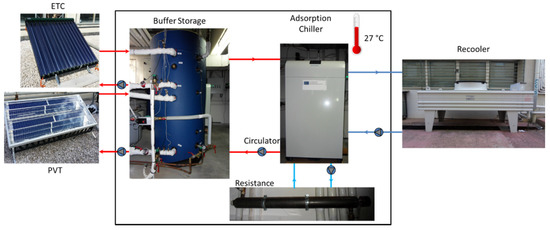 The installed solar cooling system is illustrated in Figure 1 and its layout is depicted in Figure 2. It comprises seven main components: (1) photovoltaic-thermal collectors, (2) evacuated tube solar collectors, (3) a buffer storage tank, (4) an adsorption chiller, (5) a recooler, (6) an electrical resistance, and (7) circulators. The solar panels collect solar radiation, convert it to thermal energy and provide it to the heat transfer fluid. The heat of this fluid is used to charge the buffer storage tank. The heat stored in the tank is used to power the thermally driven adsorption chiller. The chiller produces the desirable cooling and rejects heat to the environment through the dry cooler. The output cooling capacity is consumed in the electrical resistance which serves as cooling load.
