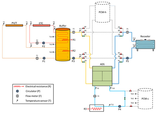The two latent heat storage systems (PCM-h for high and PCM-c for low-temperature energy storage) are installed in the experimental setup but their influence to the solar cooling system will be investigated in a future study. The backup electrical resistances R1 and R2 are used when the solar radiation is not sufficient for driving the cooling system and are not used during the presented experimental procedure.