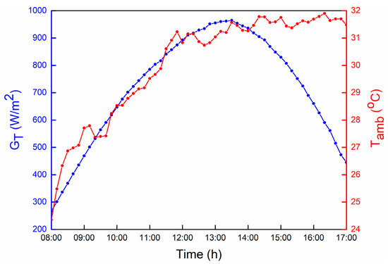 In Figure 3, the variation of ambient temperature and of the total irradiance on the solar collectors’ surface is depicted for the examined day. The maximum irradiance (964 W/m2) can be observed at 13:30 local time, while the maximum ambient temperature, which is 31.9 °C, can be observed at 16:20. The irradiance curve is skewed due to the fact that the solar collectors are not perfectly aligned to the south. It is obvious that the examined day is a typical one with respect to the climatic conditions during summer in Greece.