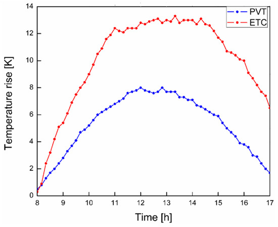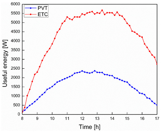 - During this period, the working fluid in PVT collectors exhibited a 7.8 K rise in temperature, thus producing 2.3 kW of useful thermal power, while in ETC series the temperature rise was 12.8 K, with a production of useful power equal to 5.6 K.