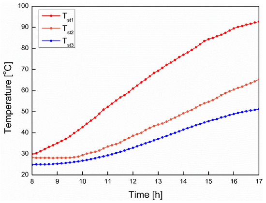 The hot water from the outlet of the ETC series enters in the higher part of the buffer tank while the outlet of the PVT the medium part of the tank. The buffer tank is insulated, and it is modeled using three mix-zones (uniform temperature is considered within each zone, Tst1 upper part, Tst2 middle part and Tst3 lower part of the tank) and it loses heat to the environment due to the temperature difference between the temperature of each zone and the temperature at the laboratory, which was kept constant at 27 °C during the whole procedure (Equation (2)). The tank heat loss coefficient receives rather low values (near 0.5 W/m2 K) due to the insulation. Therefore, the thermal energy that is stored in the tank can be expressed as the difference between the total useful energy produced by the collectors and the tank’s losses to the ambient (Equation (3)).