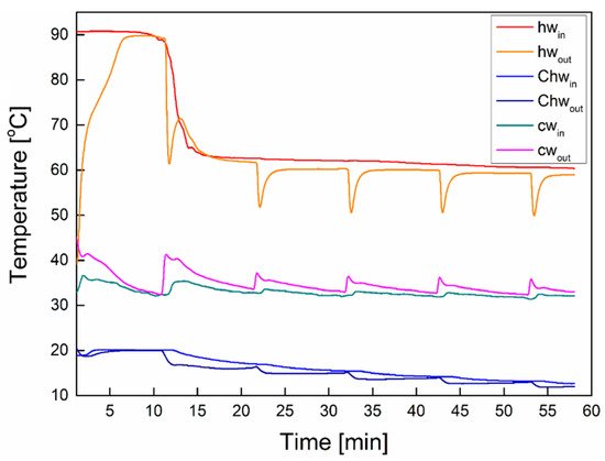 As mentioned earlier, the data required for the evaluation of the chiller’s performance were collected from the OPC every second, since the operation of the chiller is dynamic and the conditions (heat transfer fluid temperatures at the inlet and outlet of the chiller) change rapidly. The operation test lasted for an hour and was initiated after the charging phase of the buffer tank (at 17:00). The results for the heat source temperatures are shown in Figure 8. Regarding the regeneration, heat rejection and load curves, for almost 20 min, the energy provided to the chiller from the buffer tank was used to preheat the components (metal, zeolite beds, etc.), and thus no substantial cooling capacity was provided from the evaporator. This period can be characterized as the transient phase of the chiller’s operation. After those 20 min, the operation had reached its nearly steady state, and three distinct cycles were formatted. The duration of each cycle was 11 min. The sudden variations of hot water outlet temperature at the beginning of each cycle were due to the fact that adsorption chiller’s beds change roles during the switching period. Specifically, the bed that was previously acting as the adsorber was preheated in order to act as the desorber during the upcoming stage. After the three cycles under study, the chiller continued to operate by repeating the same patterns with respect to the cycle curves. However, as the operation continued, the chiller achieved lower temperatures at the evaporation outlet, as can be seen in Figure 8, reaching 12 °C after the end of the third cycle.