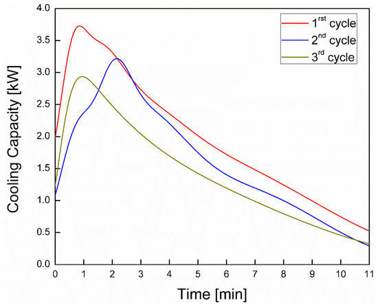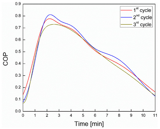 In Figure 9, the variation of the produced cooling output during the 11 min that each cycle lasts is presented. It can be observed that the maximum cooling capacity drops as the number of cycles increases. By integrating the variation of each curve with time, the average cooling production can be calculated for each cycle. The average cooling capacity for each cycle was 1.99 kW, 1.62 kW, 1.43 kW, respectively. The relatively low values of the produced cooling load can be justified by the mass flow rates chosen for the experiments, which were lower than the nominal mass flow rates of the adsorption chiller (, , ). The variation in the chiller’s COP, shown in Figure 10, follows the curves of cooling capacity, with its peak being observed one minute after the maximum cooling capacity production. The average values of COP per cycle were 0.491, 0.496 and 0.465, respectively. These values are close to the nominal one (COPnom = 0.6), which means that the adsorption chiller, although working at lower loads, exhibits sufficient performance. The obtained COP values are consistent with the available literature, both in theoretical and experimental studies. Indicatively, an average COP of 0.41 was estimated for June for an adsorption solar cooling system simulated under the climatic conditions of Athens, Greece [14]. With respect to experimental studies, a maximum COP of 0.535 was observed in a similar solar cooling system investigated under the climatic conditions of Athens, Greece [21]. Furthermore, an average COP of 0.43 was obtained in a solar driven adsorption cooling system installed at the Institute for Solar Energy (ISE) in Freiburg, Germany [25], while average COP values around 0.41 and 0.47 were obtained from a small-scale adsorption chiller tested at the University of Liège [20].