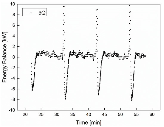 Finally, and for the overall evaluation of the experimental procedure the energy balance is applied for each cycle. Figure 12 shows the variation of the energy balance. It can be observed that during most of the cycle period, the energy balance is satisfactorily fulfilled. The same conclusion cannot be reached for the beginning and end of each cycle in which the switching process affects the energy balance substantially. This is because the heat exchangers of the adsorption chiller change their operation between adsorption and desorption mode during this phase interrupting the steady operation of the chiller.