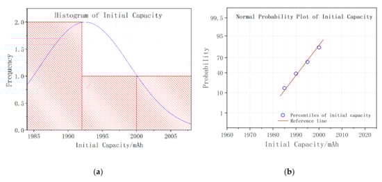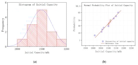 In this study, cells with good initial consistency were selected to form a battery pack. In the same production batch, twelve 18,650 lithium-ion batteries were randomly selected as the test batteries. The cells were discharged from the fully charged state at 1/20 C, and their initial discharge capacities were tested. The discharge capacity in this case was close to the maximum usable capacity of the battery. The optimal means of judging the consistency of the initial capacity is to check whether the capacity data conform to the normal distribution. The normality of the data can be verified by drawing the distribution histogram and p-p diagram of the capacity data. If the capacity obeys a normal distribution and the data are well distributed around the baseline, then the initial capacity can be considered to have good consistency. Figure 1 shows the initial capacity histogram and the normal probability plot of the cells. The data were distributed around the reference line. It can be seen that the initial capacity of the 12 cells could be modeled using a normal distribution. The fluctuation was small, and there were no abnormal values. The batteries had good initial consistency. Table 2 shows the initial capacity values of the test cells.