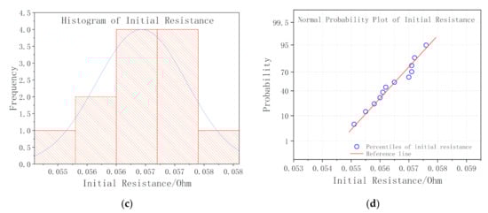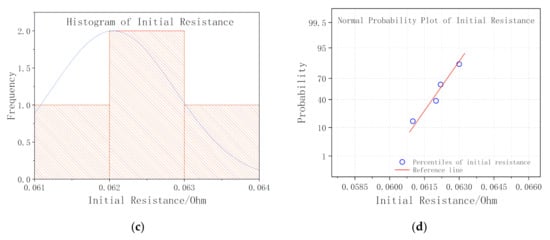 (a) Initial capacity distribution (degraded cells). (b) Normal probability plot of the initial capacity (degraded cells). (c) Initial resistance distribution (degraded cells). (d) Normal probability plot of the initial resistance (degraded cells).