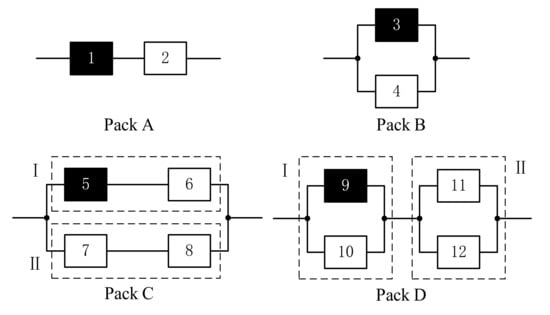As shown in Figure 3, the battery pack unbalance degradation test was divided into four different configurations. Pack A: series, Pack B: parallel, Pack C: series and parallel, and Pack D: parallel and series. Each pack was implanted with a degraded cell. The black squares in the figure represent the degraded cells, and the white squares represent the normal cells.