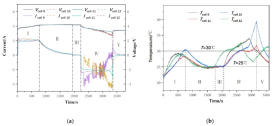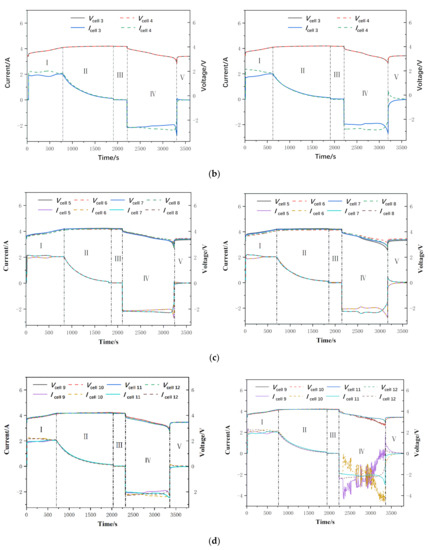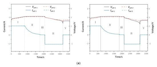 The parameter difference of each cell during the charge–discharge can directly reflect the dependence of each cell in the unbalanced state. In this research, a charge–discharge profile was used as an example to observe the difference between the typical characteristic parameters (current and voltage) of the cells in each stage of the charge–discharge cycle. As shown in Figure 4, the current value of the charging process was defined as positive, and the current value of the discharging process was negative.