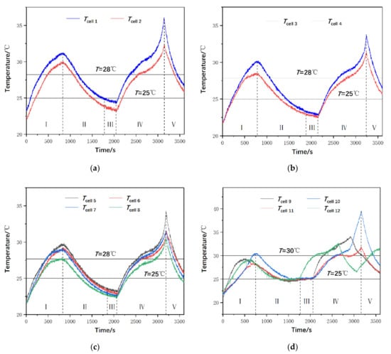 Surface temperatures of all the cells in the charge–discharge profiles: (a) Pack A; (b) Pack B; (c) Pack C; (d) Pack D.