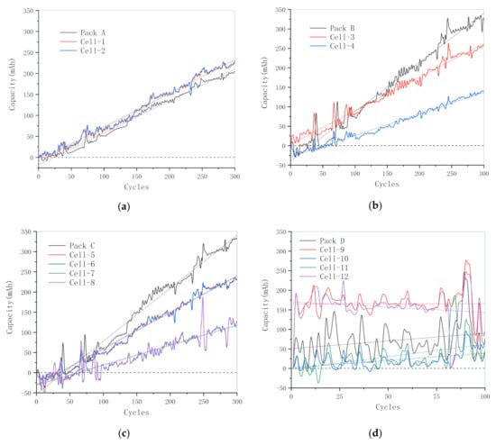 Figure 7 shows the cumulative capacity degradation of the four battery packs and cells. The first three battery packs contained 300 cycles of degradation, and Pack D contained only the data for 100 cycles prior to failure. The negative value of the degraded accumulation during the early cycles was due to the activation effect of the battery.
