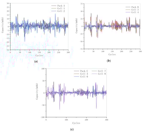 Inter-cycle capacity degradations: (a) Pack A; (b) Pack B; (c) Pack C.