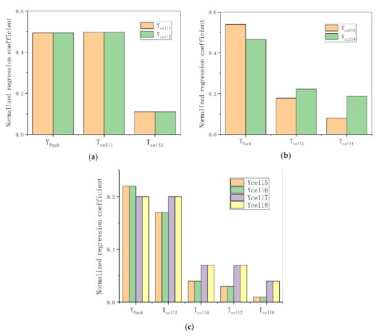 It should be noted here that the capacity of the individual cells in the independent variables needed to be a decreasing process according to the actual process. Therefore, in this process, the battery pack capacity was continuously reduced (the coefficient was positive), and the temperature of each unit cell was continuously increased (the coefficient was negative).