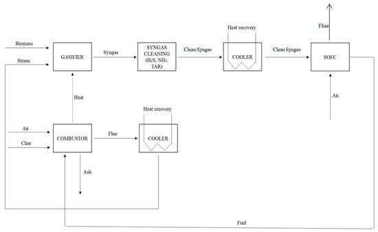 Simplified block diagram of biomass gasification, syngas cleaning, and the SOFC system.