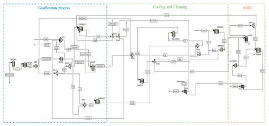 where, fractional conversion for H2S is considered to be equal to 1 and for NH3 equal to 0.5 [37]. Stream S2 out of the RSTOIC block goes into a separator, called SEP, which separates the stream into three sub-streams: VOLATILE, CHAR, and H2SNH3, which are, respectively, the volatile part, the char part, and the stream made of ammonia and hydrogen sulphide. Then, the VOLATILE stream is divided into two sub-streams: VOL, which is mixed with the oxidizing fluid and sent to the gasifier GASIF; and H2, which is used to simulate tar production in the RStoic block called TARPROD. The CHAR stream is separated into two sub-streams: S4 to represent the char reacted in the gasifier and S3 to represent the unreacted char. The tar formation is assumed as toluene and benzene. The amount of production of tar is fixed at 7 g/Nm3 (Nm3 is considered at the standard temperature of 25 °C and standard pressure of 1 bar) of toluene and 8 g/Nm3 of benzene by a Design specs on the stream of H2 and S3 based on the literature [38]. The streams AIR, OXYG, and STEAM were integrated within the model for data fit reasons; in fact, the data fit, better explained in Section 2.3, is based on experimental data, which use steam and/or air and/or oxygen as an oxidizing agent, making the model feasible for a wide range of case studies with different combinations of gasification agent. Then, the stream S5 represents the gasification agent. In the present case study, only steam is fed. The stream S4 is split into two sub-streams that represent the amount of char that moves into the combustor COMBUST and into the gasifier GASIF. The stream S8 is the stream that represents the real output of the gasifier; in fact, it is made of the union of GASRAW, NH3H2S, and TAR streams. Before going to the SOFC, syngas S8 needs to be clean; for this reason, the following blocks were added: a RGibbs reactor DOLOMITH, which simulates dolomite reactions at high temperatures to lower tar; a RStoic reactor CANDLE, which represents the catalytic filter reaction; and a REquil reactor ZNOZNS, which simulates the reaction of ZnO with H2S. The syngas cleaned goes into the SOFC system, developed by the use of a REquil ANODE, which simulates the anode; a separator CATHODE, which simulates the cathode; a RStoic reactor AFTERBURN, which simulates the combustion of the fuel; and an exchanger EX05.